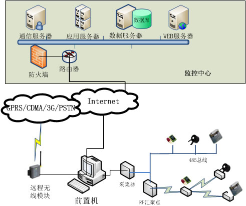 環(huán)境監(jiān)測報(bào)警系統(tǒng)通過采集現(xiàn)場傳感器數(shù)據(jù),并將數(shù)據(jù)通過有線、無線方式實(shí)時傳輸?shù)焦ぷ髡旧线M(jìn)行監(jiān)測、存儲與分析,輸出曲線與多類圖表,進(jìn)行統(tǒng)計(jì)分析和檔案記錄;系統(tǒng)提供手機(jī)、短信和郵件多種遠(yuǎn)程報(bào)警功能,供事后分析處理;可根據(jù)用戶應(yīng)用靈活配置各類環(huán)境因子傳感器;系統(tǒng)具有分級和角色權(quán)限管理功能,為不同用戶管理提供了一個多級配置管理的監(jiān)控平臺,為現(xiàn)場管理和質(zhì)量控制提供強(qiáng)有力的技術(shù)保障。系統(tǒng)結(jié)構(gòu)如下圖: