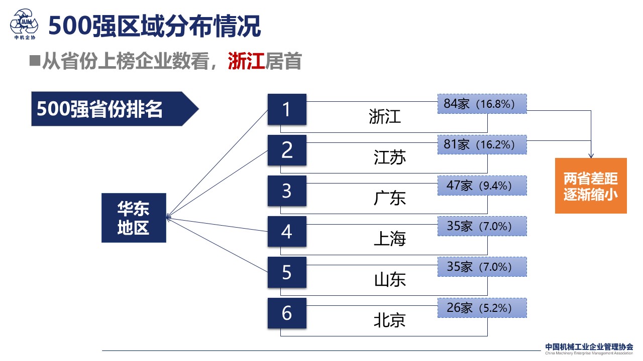 從500強上榜企業(yè)區(qū)域分布來看,全國有29個省份地區(qū)企業(yè)進(jìn)入榜單,浙江省、江蘇省仍然為上榜企業(yè)大省,分別有84家、81家企業(yè)入圍,同比兩省入榜企業(yè)數(shù)量差距逐漸縮小。