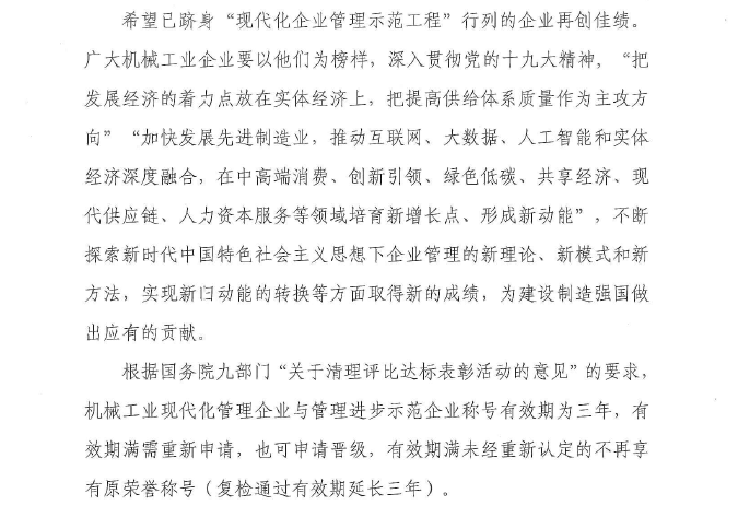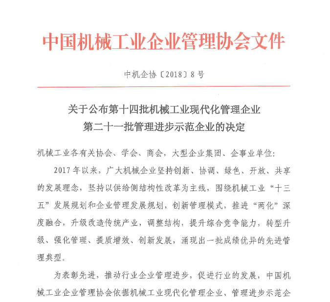 關(guān)于公布第十四批機(jī)械工業(yè)現(xiàn)代化管理企業(yè)、第二十一批管理進(jìn)步示范企業(yè)的決定-中機(jī)企協(xié)〔2018〕8號(hào).pdf
