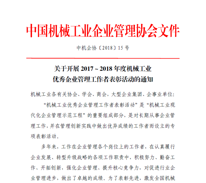 關(guān)于開展2017~2018年度機械工業(yè)優(yōu)秀企業(yè)管理工作者表彰活動的通知-中機企協(xié)〔2018〕15號.pdf