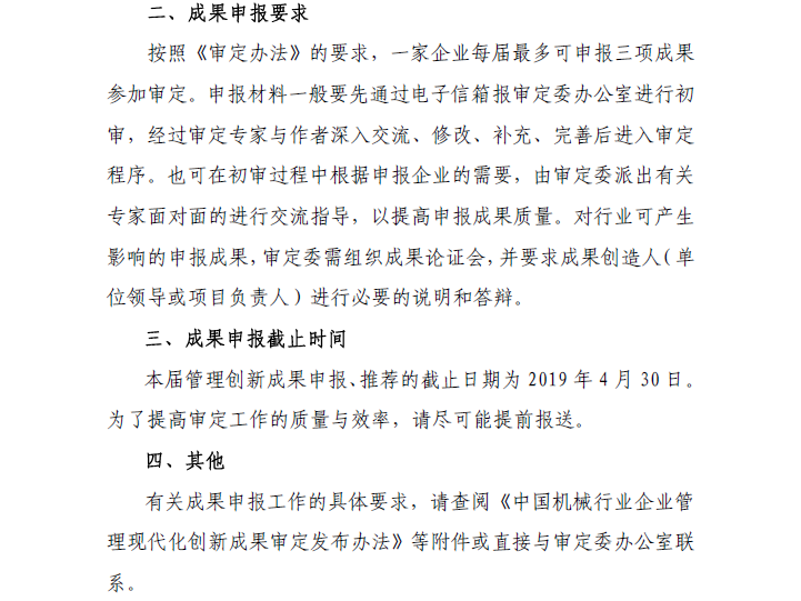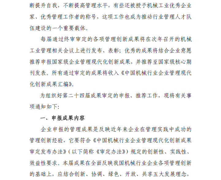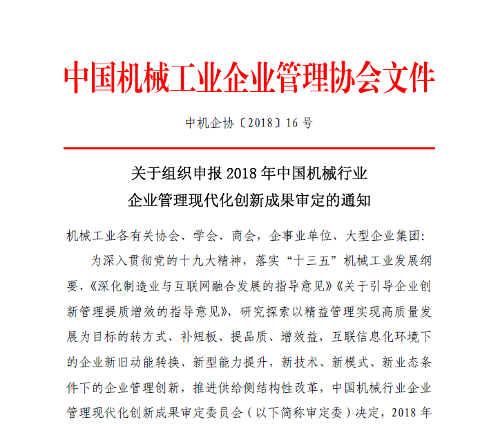 關(guān)于組織申報(bào)2018年中國(guó)機(jī)械行業(yè)企業(yè)管理現(xiàn)代化創(chuàng)新成果審定的通知
