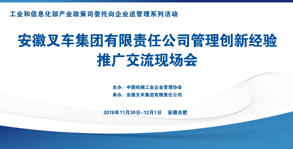 2018年11月29日-12月1日,工信部產業(yè)政策司委托中國機械工業(yè)企業(yè)管理協會(簡稱中機企協)主辦、安徽叉車集團有限責任公司(簡稱合力)承辦的機械行業(yè)“向企業(yè)送管理”現場交流活動在安徽省合肥市隆重舉辦。工信部產業(yè)司產業(yè)組織處處長匡佩遠,趙薛憶,中機企協理事長孫伯淮,常務副理事長李玲,副理事長于中赤、張德進、張愛群,以及來自機械行業(yè)的企業(yè)代表180余人參加了活動。