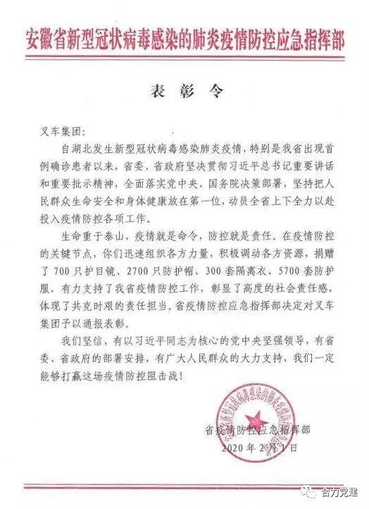 表彰令指出,安徽叉車集團積極捐贈防疫急需物資,有力支持了我省疫情防控工作,彰顯了高度的社會責任感,體現了共克時艱的責任擔當,省疫情防控應急指揮部決定對安徽叉車集團予以通報表彰。