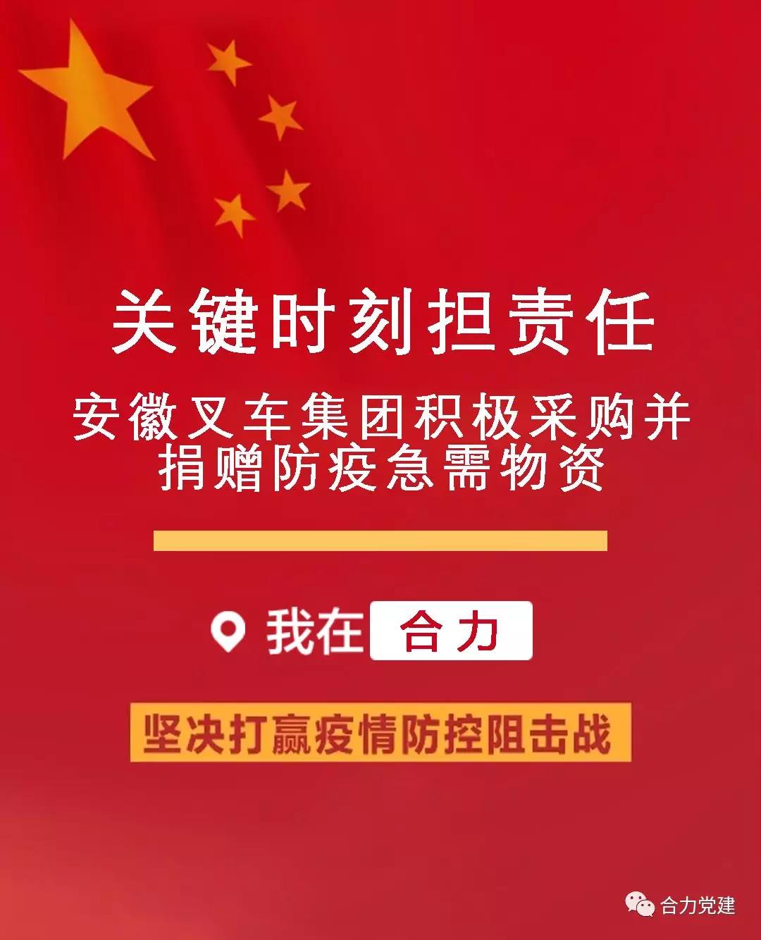 服務大局,不講條件!防控需要,合力支持!安徽叉車集團深入學習習近平總書記關于防控新型冠狀病毒感染的肺炎疫情重要指示精神,積極落實安徽省委省政府及省國資委決策部署,在做好疫情防控各項工作的基礎上,積極調動全球資源,第一時間向安徽省疫情防控應急指揮部捐贈了護目鏡、防護帽、隔離衣和防護服等防疫物資共計9400件,全力做好新型冠狀病毒感染的肺炎疫情防控及應對工作,受到了安徽省疫情防控應急指揮部的表彰。